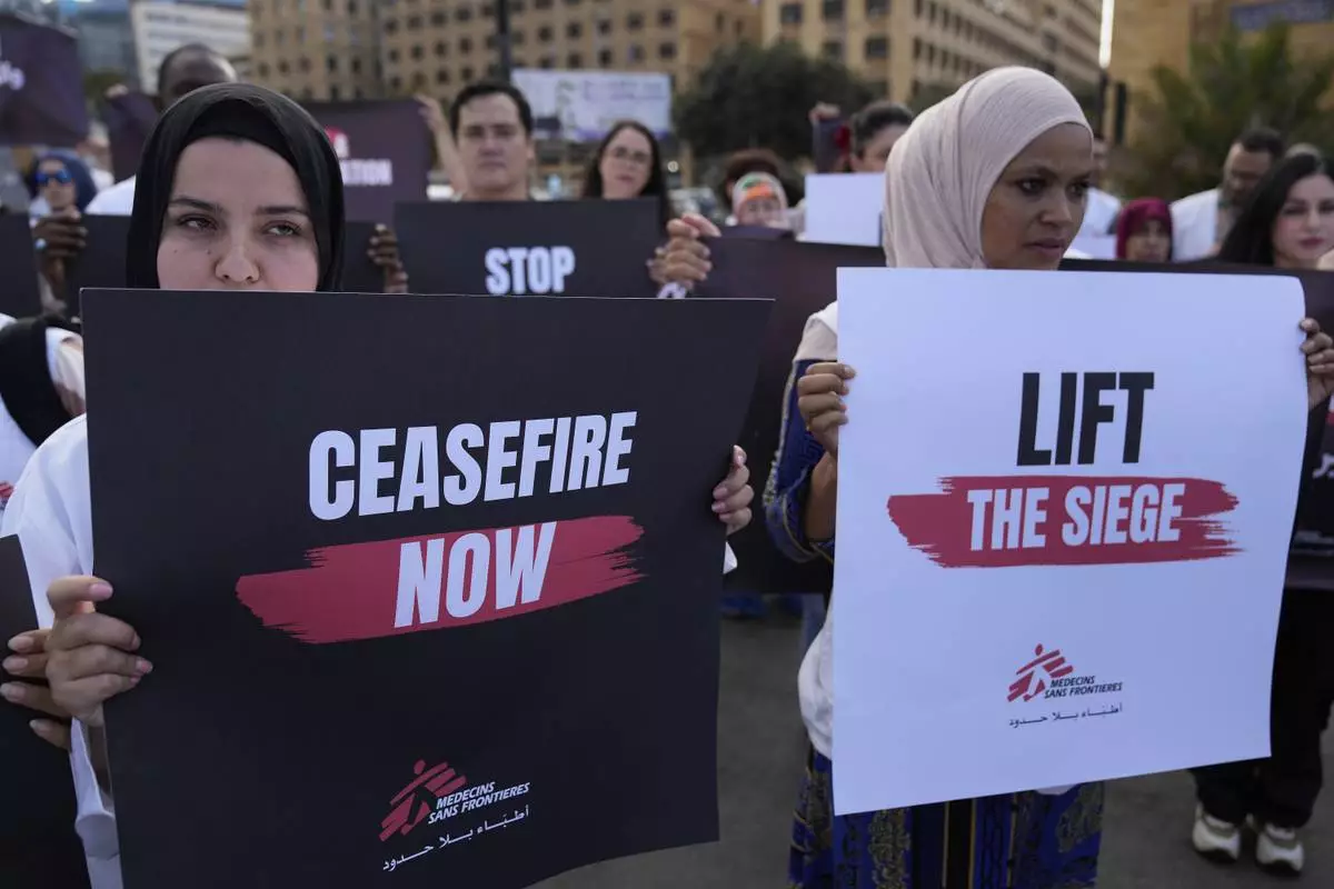 Members of the international humanitarian group 'Doctors Without Borders' hold placards during a protest, calling for an end of the war in Gaza and for an immediate cease-fire, at Martyrs' Square in downtown Beirut, Lebanon, Monday, Sept. 15, 2025. (AP Photo/Hussein Malla)