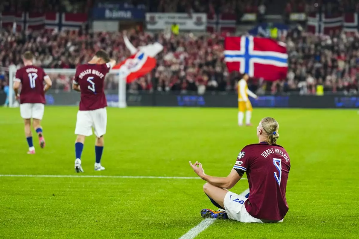 Norway's Erling Haaland celebrates scoring during the World Cup qualifying soccer match between Norway and Moldova at Ullevaal Stadion, Oslo, Tuesday Sept. 9, 2025. (Fredrik Varfjell/NTB via AP)