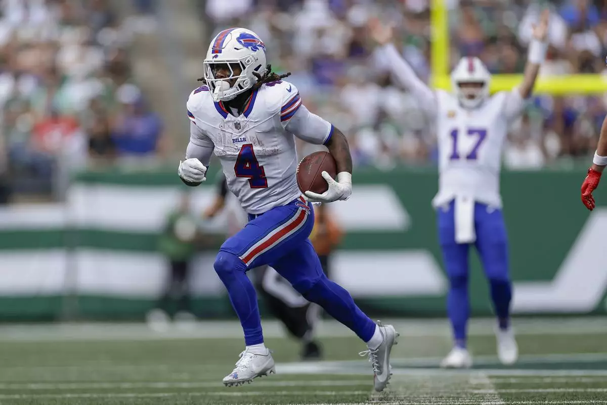 Buffalo Bills running back James Cook (4) runs the ball for a touchdown against the New York Jets during the second quarter of an NFL football game, Sunday, Sept. 14, 2025, in East Rutherford, N.J. (AP Photo/Adam Hunger)