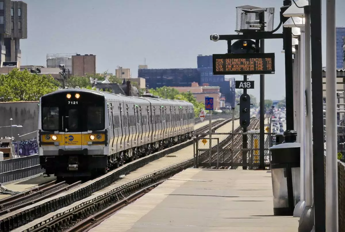 FILE - An Atlantic Terminal bound LIRR train arrives at the Nostrand Avenue station, July 9, 2017, in New York. (AP Photo/Bebeto Matthews, File)