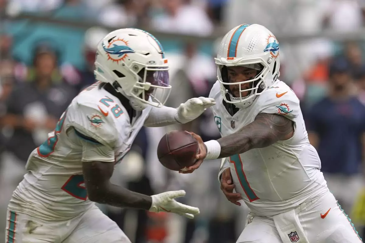Miami Dolphins' Tua Tagovailoa hands off to De'Von Achane during the second half of an NFL football game against the New England Patriots Sunday, Sept. 14, 2025, in Miami Gardens, Fla. (AP Photo/Rebecca Blackwell)