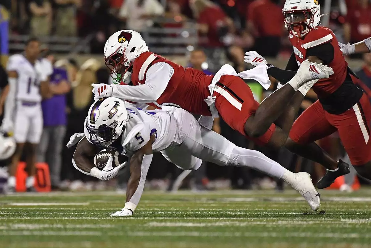 Louisville linebacker Stanquan Clark, top left, tackles James Madison running back Ayo Adeyi (5) during the second half of an NCAA college football game in Louisville, Ky., Friday, Sept. 5, 2025. (AP Photo/Timothy D. Easley)
