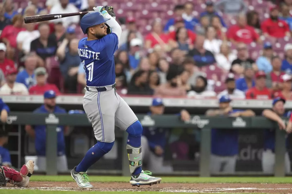Toronto Blue Jays' Bo Bichette follows through after hitting a three-run home run in the second inning of a baseball game Cincinnati Reds, Tuesday, Sept. 2, 2025, in Cincinnati. (AP Photo/Kareem Elgazzar)
