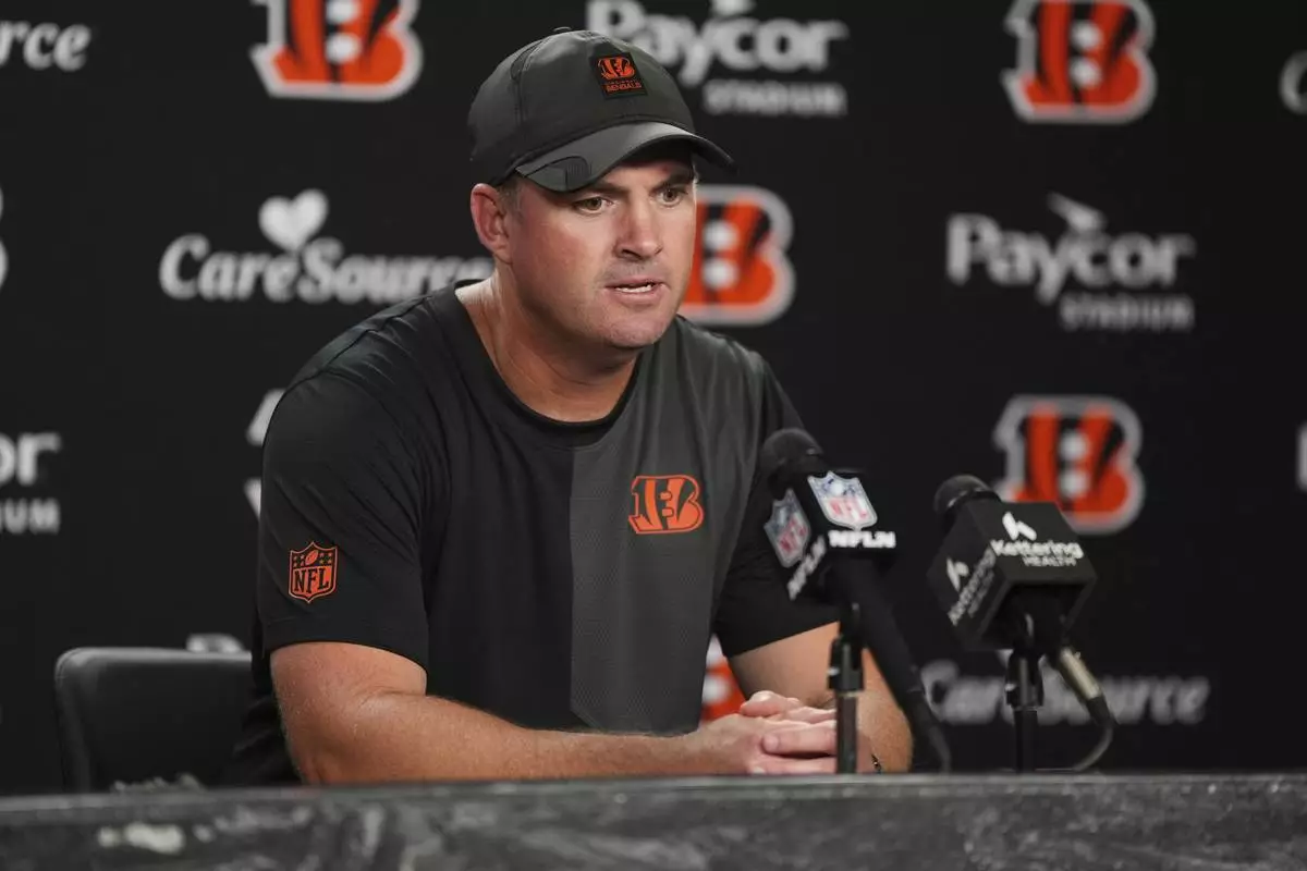 Cincinnati Bengals head coach Zac Taylor answers questions after an NFL football game against the Jacksonville Jaguars, Sunday, Sept. 14, 2025, in Cincinnati. (AP Photo/Jeff Dean)