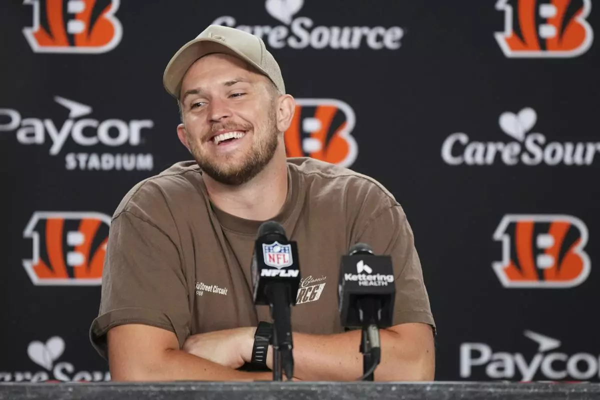 Cincinnati Bengals quarterback Jake Browning answers questions after an NFL football game against the Jacksonville Jaguars, Sunday, Sept. 14, 2025, in Cincinnati. (AP Photo/Jeff Dean)