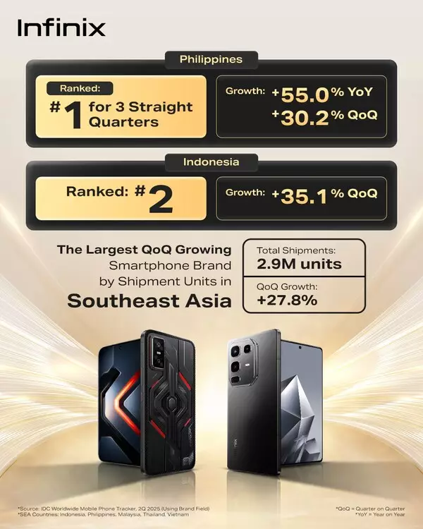 HONG KONG, Sept. 16, 2025 /PRNewswire/ -- According to the latest Worldwide Quarterly Mobile Phone Tracker report released by International Data Corporation (IDC) for Q2 2025, Infinix achieved the largest quarter-on-quarter shipment increase in Southeast Asia formed by Philippines, Malaysia, Thailand, Indonesia, and Vietnam, with a gain of over 0.6 million units. The brand also led in market share across several individual countries, ranking No.1 in the Philippines and Pakistan, and No.2 in Indonesia and Bangladesh.
