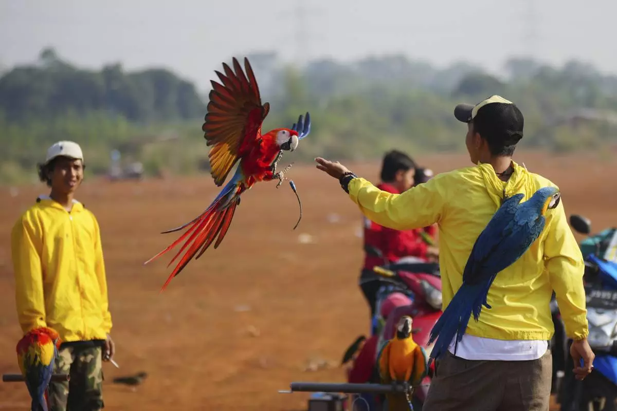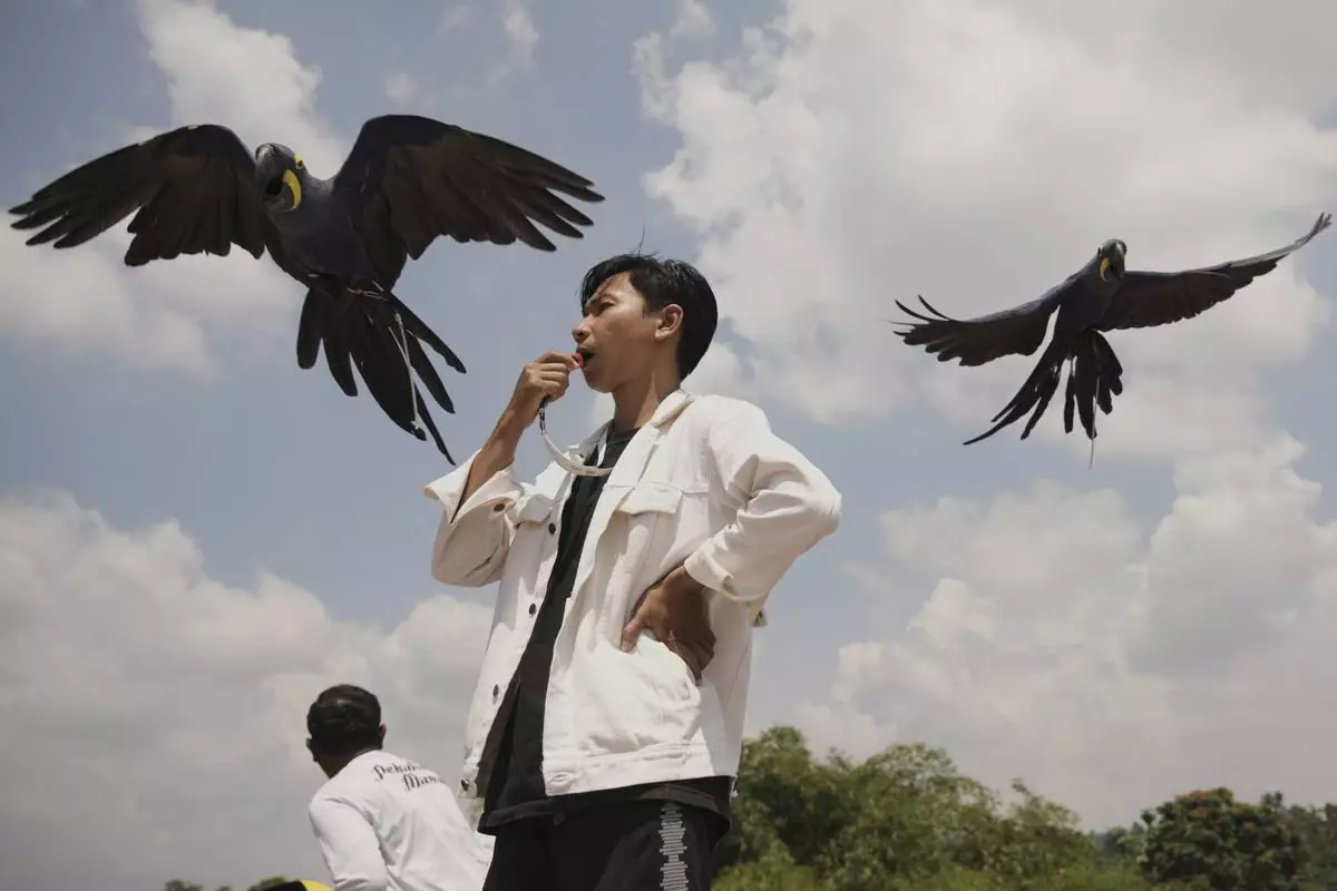 Ramli’s passion for birds began in 2018 when he kept small parakeets, but soon he dreamed of caring for larger, more elegant species like macaws. Inspired by videos on social media showing birds returning faithfully to their trainers after flying freely, the 33-year-old decided to leave his job as a motorcycle mechanic to focus on this new path.
