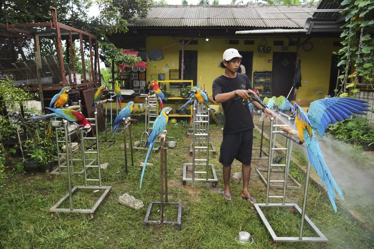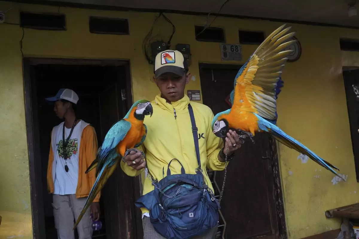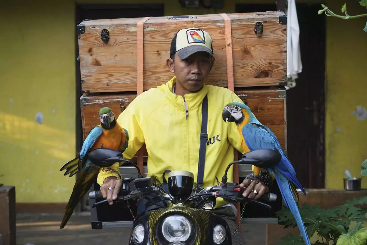 DEPOK, Indonesia (AP) — With two brightly feathered macaws perched on his hands, their long tails brushing against him, Albi Albar Ramli balanced on his motorbike on a Saturday morning before heading off to an open field near his home.