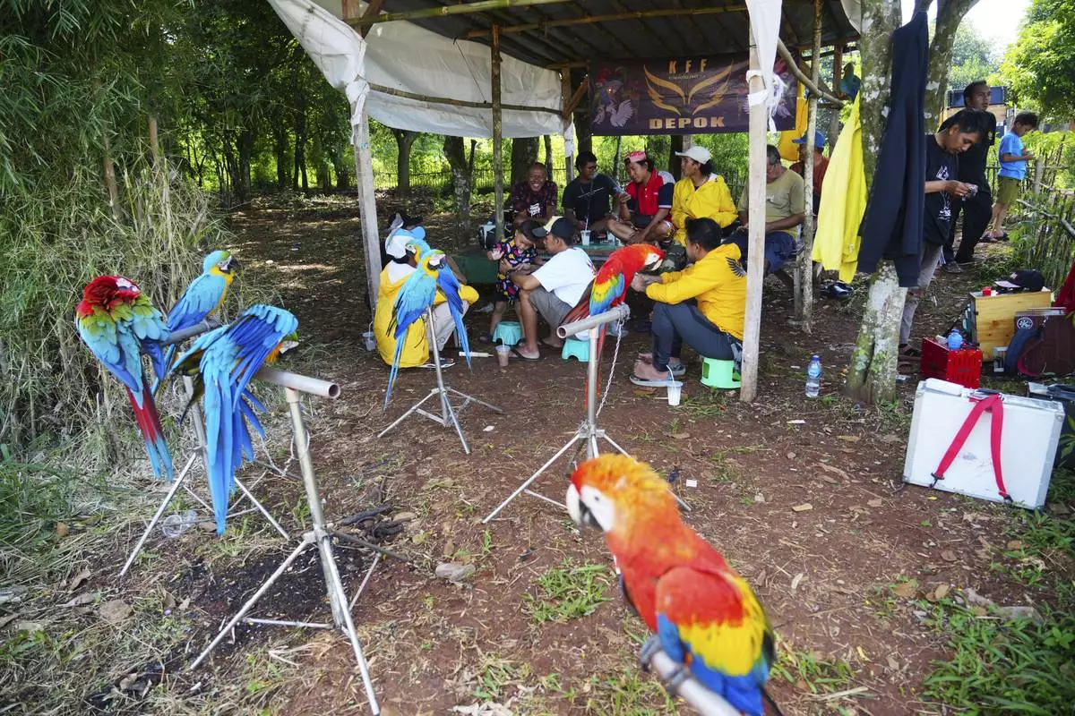 Macaw enthusiasts chat as they rest after a training session in Depok, on the outskirts of Jakarta, Indonesia, Saturday, Aug. 16, 2025. (AP Photo/Tatan Syuflana)