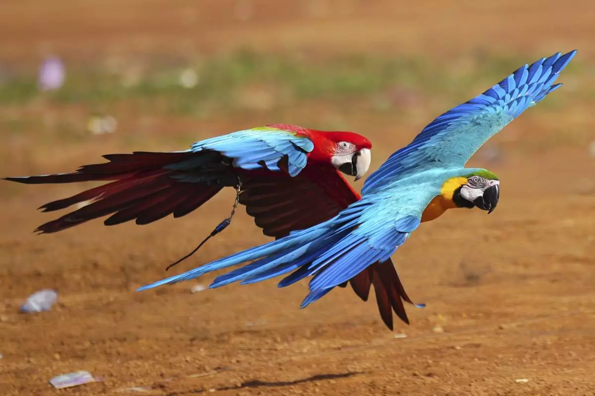 Macaws fly during a training session in Depok, on the outskirts of Jakarta, Indonesia, Saturday, Aug. 16, 2025. (AP Photo/Tatan Syuflana)