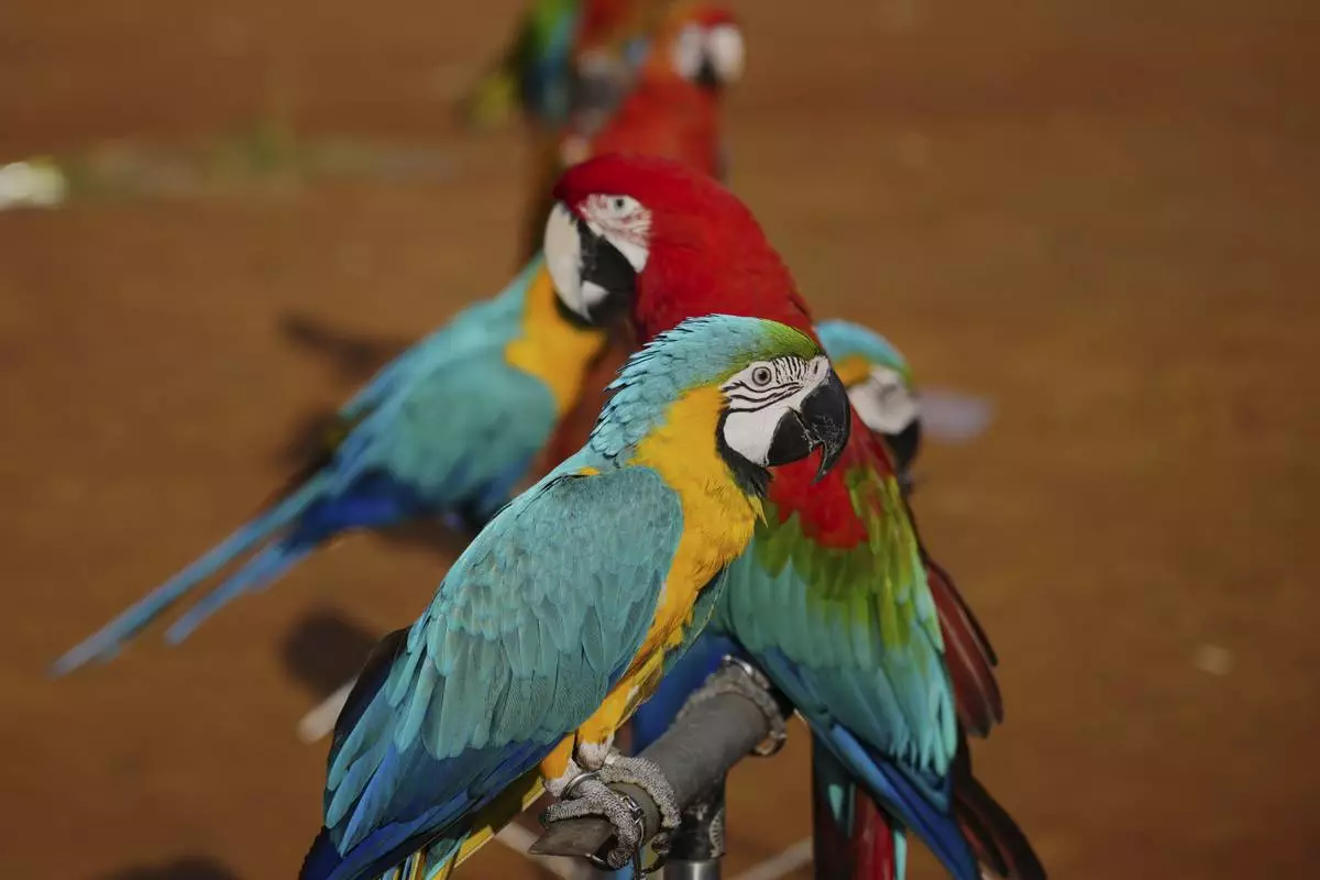 Macaws perch on stands during a training session in a field in Depok, on the outskirts of Jakarta, Indonesia, Saturday, Aug. 16, 2025. (AP Photo/Tatan Syuflana)