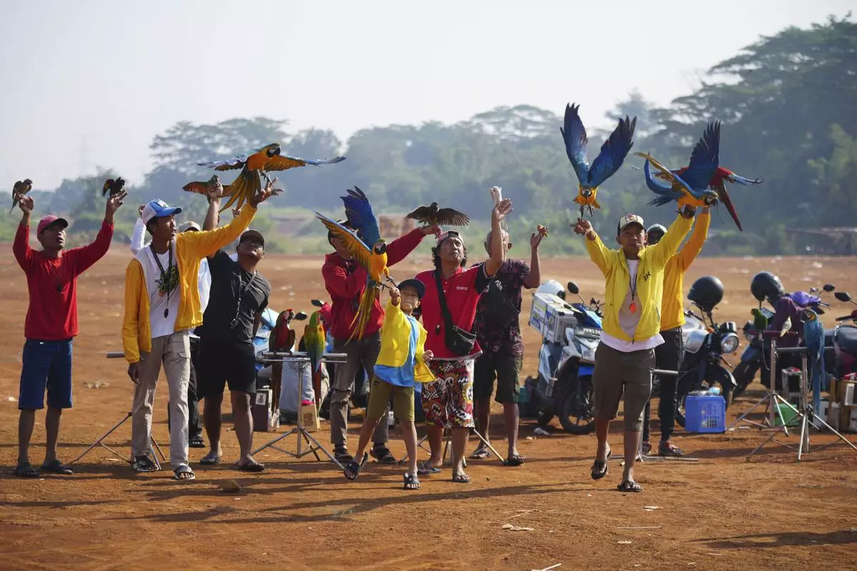 Participants release their macaws during a free fly competition in Sentul, Indonesia, Saturday, Aug. 23, 2025. (AP Photo/Tatan Syuflana)