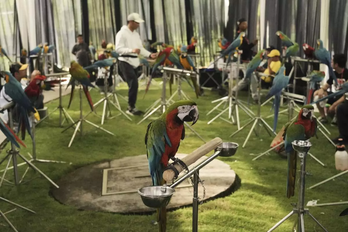 Macaws perch on stands during a free fly competition in Sentul, Indonesia, Saturday, Aug. 23, 2025. (AP Photo/Tatan Syuflana)