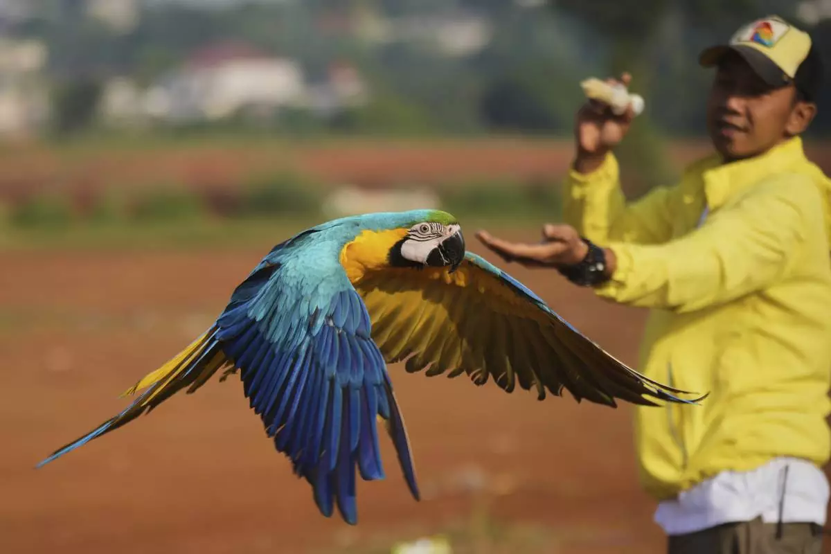 Albi Albar Ramli trains macaws in a field in Depok, on the outskirts of Jakarta, Indonesia, Saturday, Aug. 16, 2025. (AP Photo/Tatan Syuflana)