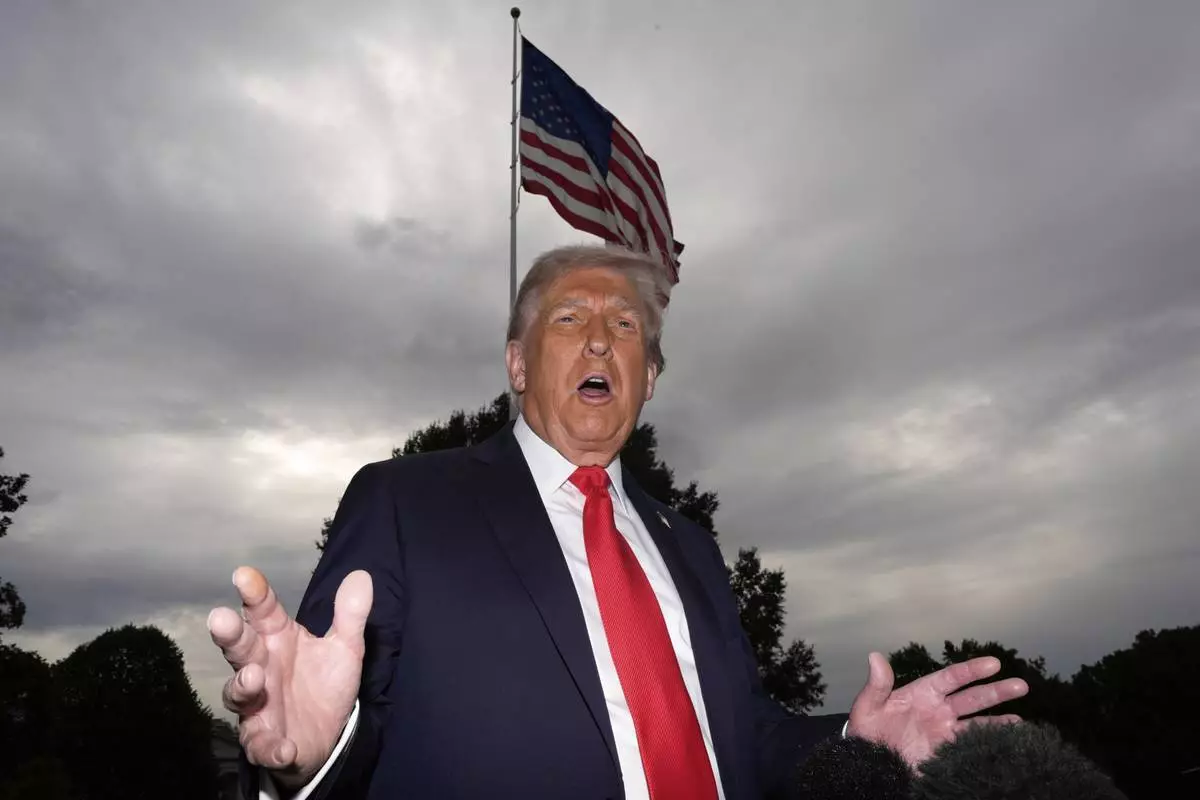 President Donald Trump speaks with reporters before departing on Marine One from the South Lawn of the White House, Tuesday, Sept. 16, 2025, in Washington. (AP Photo/Alex Brandon)