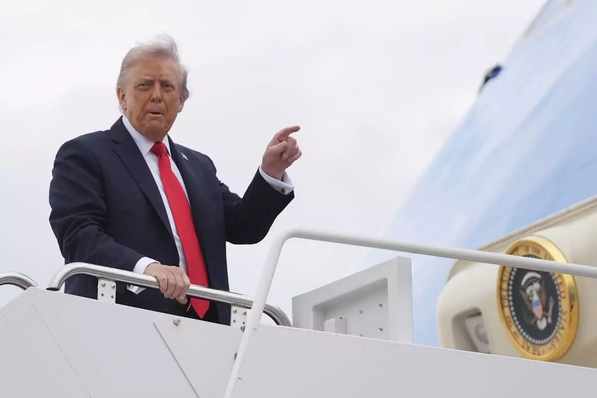 President Donald Trump and first lady Melania Trump board Air Force One, Tuesday, Sept. 16, 2025, in Joint Base Andrews, Md. (AP Photo/Evan Vucci)