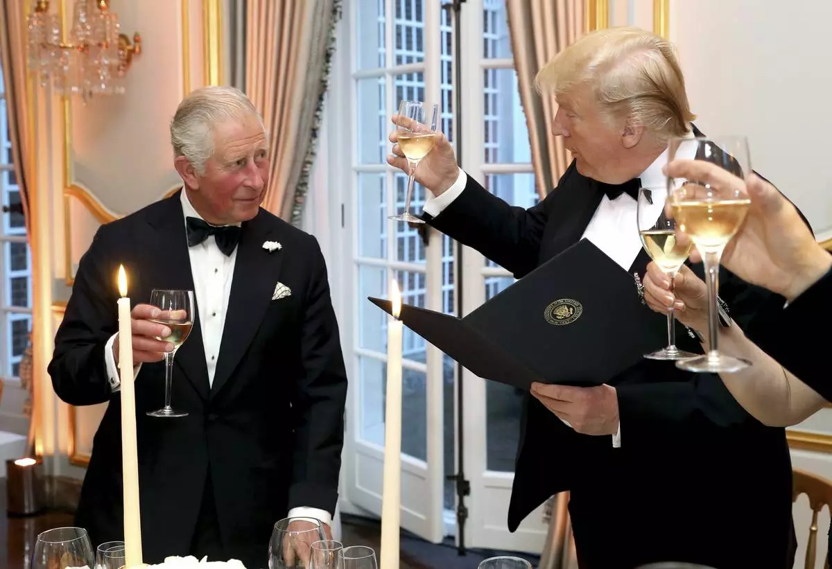 FILE - U.S. President Donald Trump and Britain's Prince Charles toast, during the Return Dinner in Winfield House, the residence of the Ambassador of the United States of America to the UK, in Regent's Park, part of the president's state visit to the UK, in London, Tuesday, June 4, 2019. (Chris Jackson/Pool Photo via AP, File)