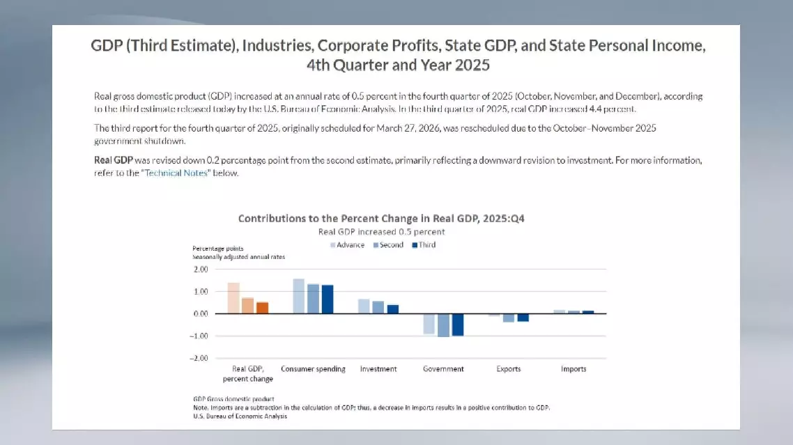 The U.S. gross domestic product (GDP) increased at an annual rate of 0.5 percent in the fourth quarter of 2025, according to the third estimate report released Thursday by the U.S. Commerce Department.