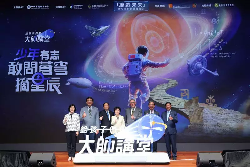 Shen Beili, Vice Chairperson of CSCLF (centre); Yin Zonghua, Deputy Director of the Liaison Office of the Central People's Government in the HKSAR (3rd left); Clarence Leung, Under Secretary for Home and Youth Affairs of the HKSAR Government (2nd left); Professor Wu Weiren, Chief Designer of China's Lunar Exploration Program, China National Space Administration Lunar Exploration and Aerospace Engineering Center and Academician of the Chinese Academy of Engineering (2nd right); Lester Huang, Deputy Chairman of The Hong Kong Jockey Club and IoP Chairman (3rd right); Hsu Siu-man, Executive Director of The Hong Kong Federation of Youth Groups (1st left) and Professor Herman Hu, Founding President of Hong Kong Rosamond Foundation (1st right) at the Hong Kong launch ceremony of Nurturing Future InnoTech Talent Project.