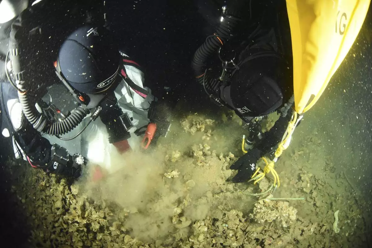 In this undated photo provided by the Greek Culture Ministry on Monday, Sept. 15, 2025, divers carefully sift to recover objects from the wreck site of the Britannic, sister ship to the Titanic, for the first time since the ocean liner sank in the Aegean Sea more than a century ago after striking a mine during World War I. (Greek Culture Ministry via AP)