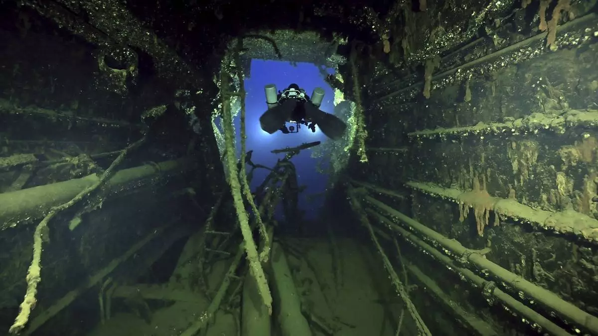 In this undated photo provided by the Greek Culture Ministry on Monday, Sept. 15, 2025, divers illuminate the wreck's interior of the Britannic, sister ship to the Titanic, for the first time since the ocean liner sank in the Aegean Sea more than a century ago after striking a mine during World War I. (Greek Culture Ministry via AP)