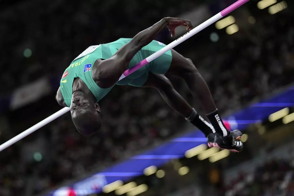 Australia's Yual Reath makes an attempt in the men's high jump final at the World Athletics Championships in Tokyo, Tuesday, Sept. 16, 2025. (AP Photo/Matthias Schrader)