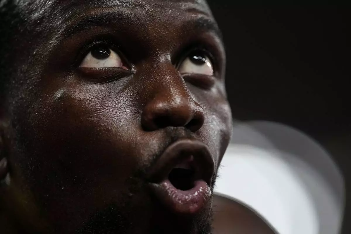 Jamaica's Demario Prince reacts after a men's 110 meters hurdles semifinal at the World Athletics Championships in Tokyo, Tuesday, Sept. 16, 2025. (AP Photo/Petr David Josek)