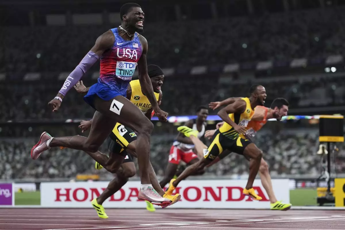 United States' Cordell Tinch wins the gold in the men's 110 meters hurdles final at the World Athletics Championships in Tokyo, Tuesday, Sept. 16, 2025. (AP Photo/Petr David Josek)