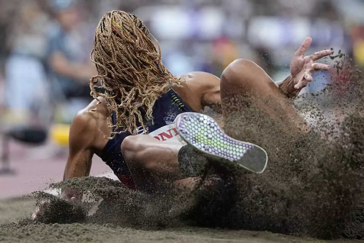 United States' Agur Dwol makes an attempt in the women's triple jump qualification at the World Athletics Championships in Tokyo, Tuesday, Sept. 16, 2025. (AP Photo/Matthias Schrader)