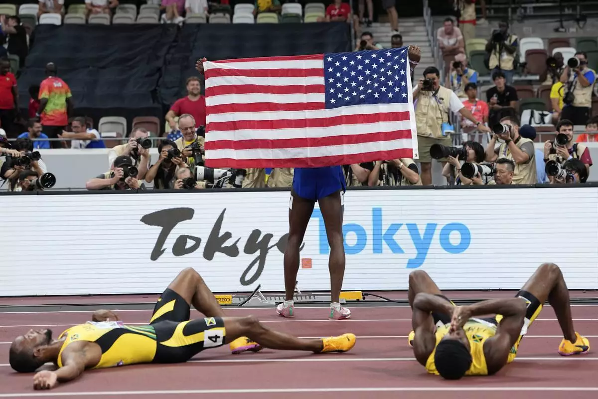 United States' Cordell Tinch poses for photos after winning the men's 110 meters hurdles final at the World Athletics Championships in Tokyo, Tuesday, Sept. 16, 2025. (AP Photo/Ashley Landis)