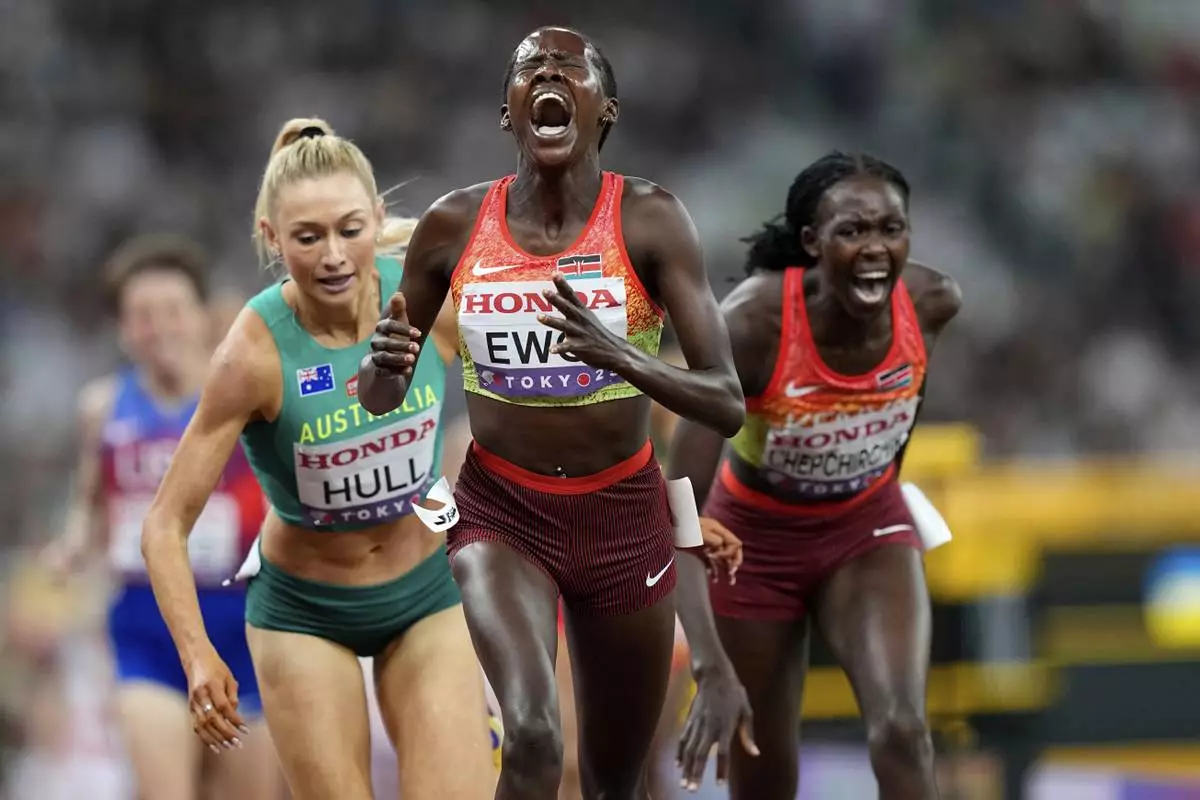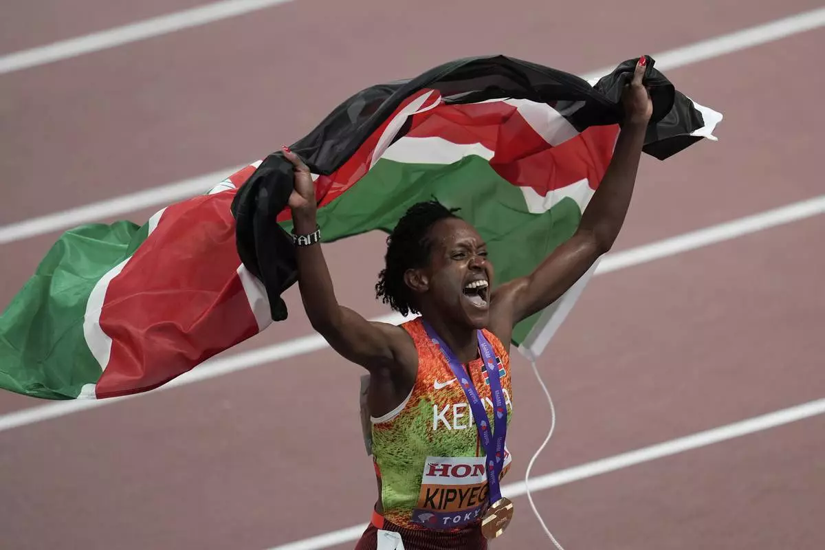 Kenya's Dorcus Ewoi reacts after taking the silver in the women's 1,500 meters final at the World Athletics Championships in Tokyo, Tuesday, Sept. 16, 2025. (AP Photo/Petr David Josek)