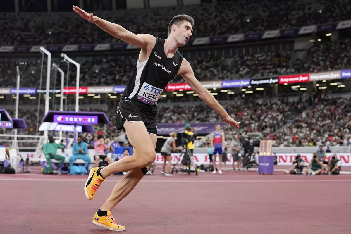 New Zealand's Hamish Kerr reacts in the men's high jump final at the World Athletics Championships in Tokyo, Tuesday, Sept. 16, 2025. (AP Photo/Ashley Landis)
