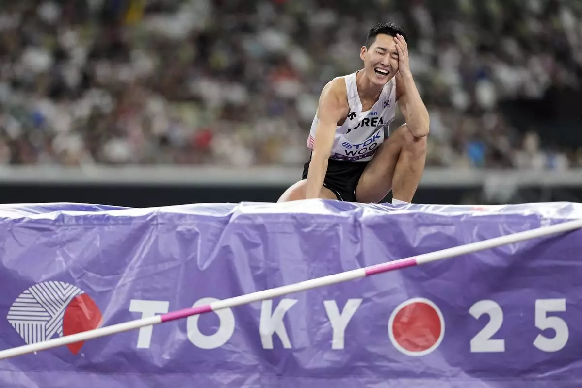 South Korea's Woo Sang-hyeok reacts after an attempt in the men's high jump final at the World Athletics Championships in Tokyo, Tuesday, Sept. 16, 2025. (AP Photo/Matthias Schrader)