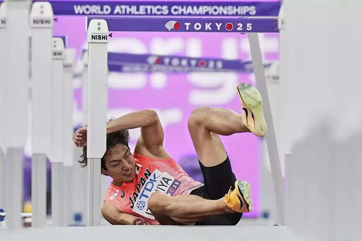 Japan's Shunsuke Izumiya crashes in a men's 110 meters hurdles semifinal at the World Athletics Championships in Tokyo, Tuesday, Sept. 16, 2025. (AP Photo/Petr David Josek)