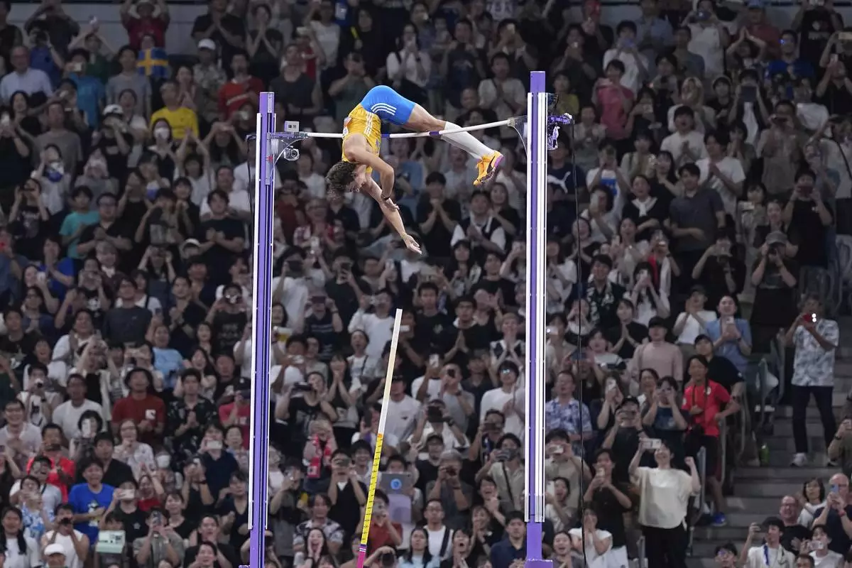 Spectators celebrate as Sweden's Armand Duplantis makes a clearance to break the world record after winning gold in the men's pole vault final at the World Athletics Championships in Tokyo, Monday, Sept. 15, 2025. (AP Photo/Petr David Josek)