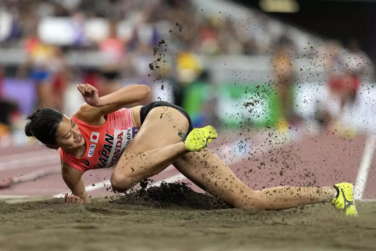 Japan's Maoko Takashima makes an attempt in the women's triple jump qualification at the World Athletics Championships in Tokyo, Tuesday, Sept. 16, 2025. (AP Photo/Matthias Schrader)