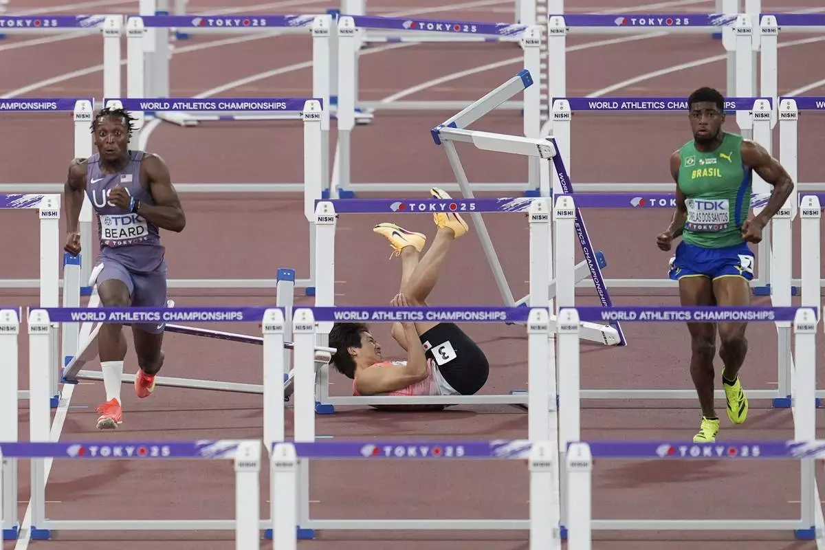 Japan's Shunsuke Izumiya, center, falls as United States' Dylan Beard and Brazil's Thiago Resende Ornelas Dos Santos compete in the men's 110 meters hurdles semifinal at the World Athletics Championships in Tokyo, Tuesday, Sept. 16, 2025. (AP Photo/Abbie Parr)