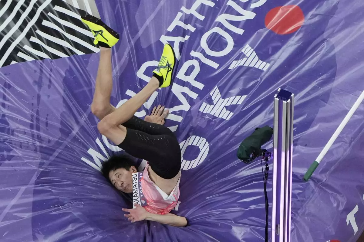 Japan's Ryoichi Akamatsu fails an attempt during the men's high jump final at the World Athletics Championships in Tokyo, Tuesday, Sept. 16, 2025. (AP Photo/Bernat Armangue)