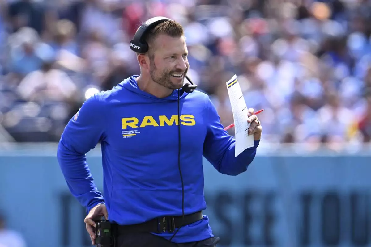 Los Angeles Rams head coach Sean McVay stands on the sideline during the first half of an NFL football game against the Tennessee Titans, Sunday, Sept. 14, 2025, in Nashville, Tenn. (AP Photo/John Amis)