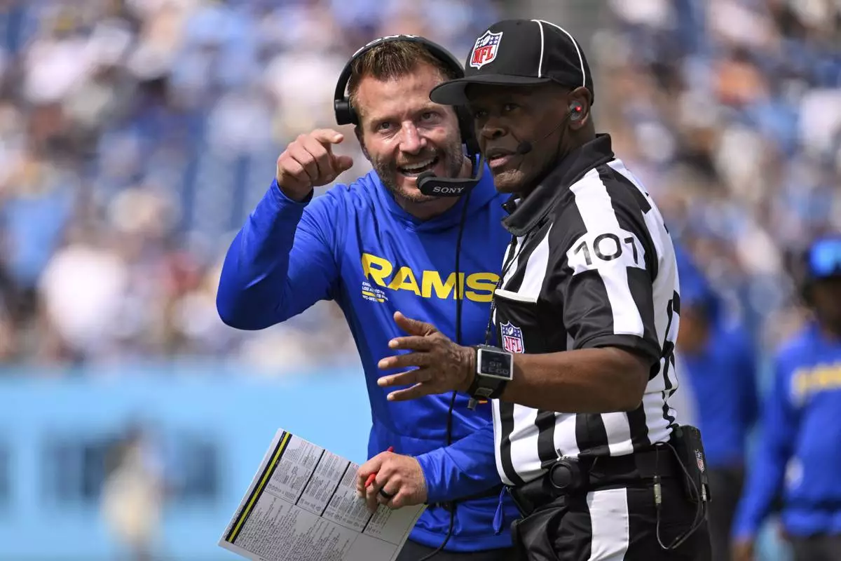Los Angeles Rams head coach Sean McVay talks with an official during the second half of an NFL football game against the Tennessee Titans, Sunday, Sept. 14, 2025, in Nashville, Tenn. (AP Photo/John Amis)