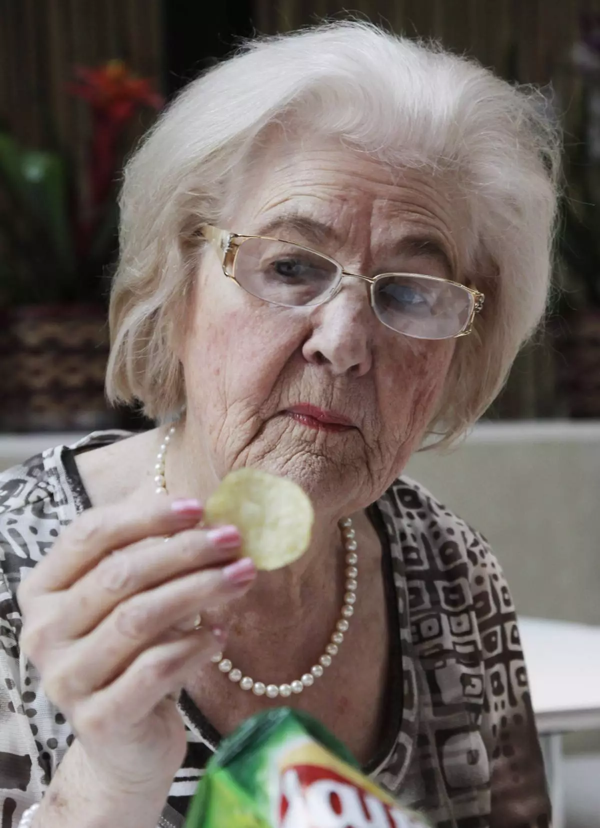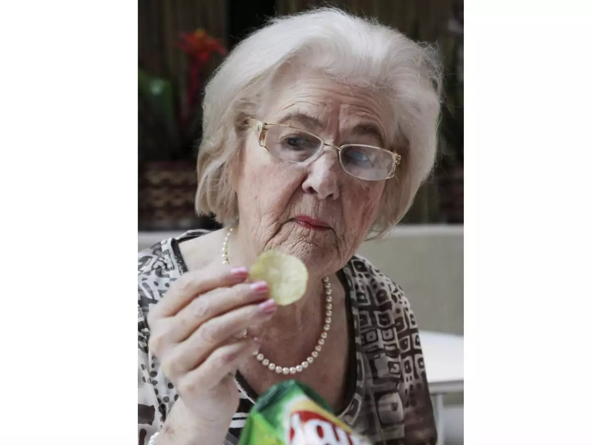 FILE - In this March 14, 2012 file photo, Marilyn Hagerty samples a Lays potato chip during an interview with The Associated Press in New York. (AP Photo/Mark Lennihan, File)