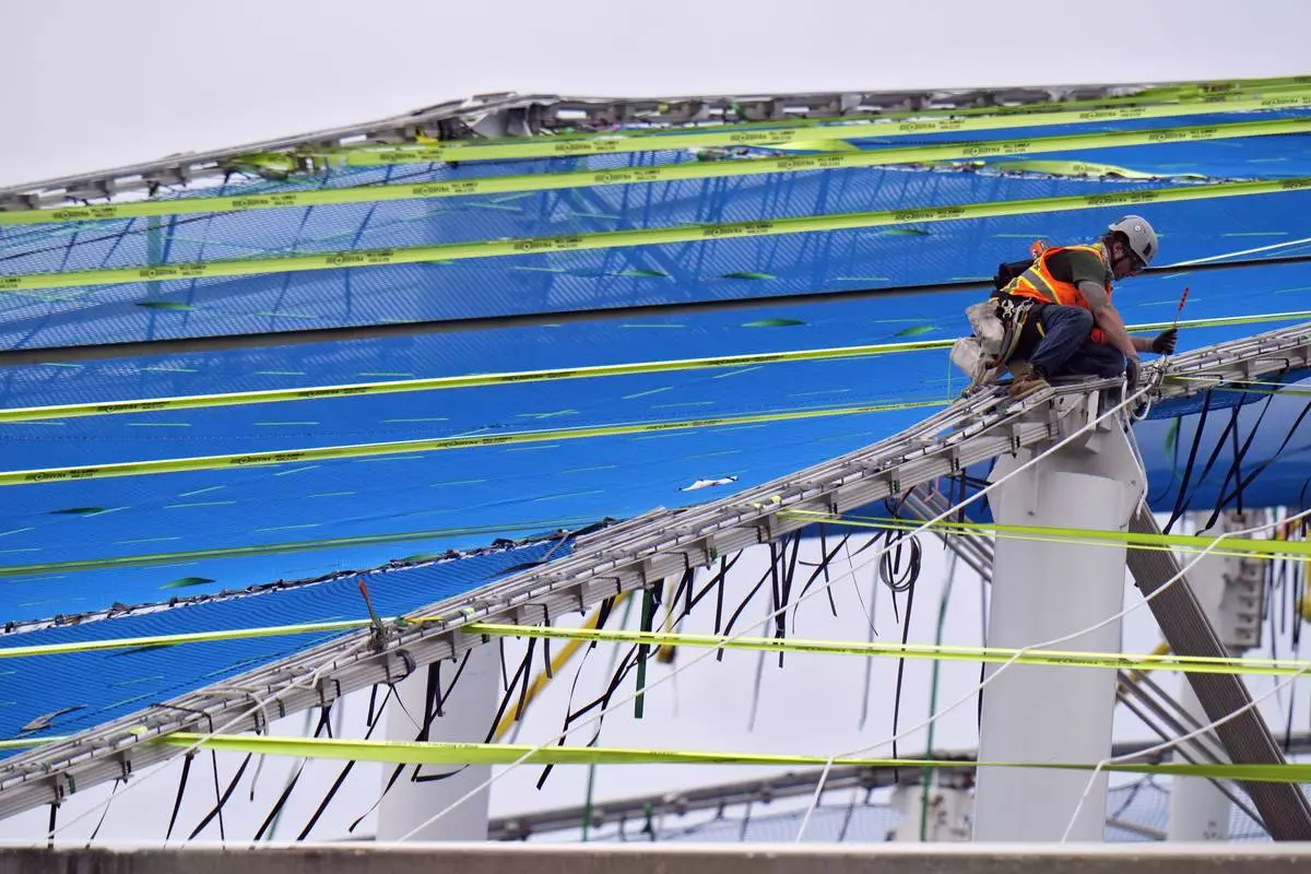 Workers replace panels on the new roof on Tropicana Field Friday, Sept. 12, 2025, in St. Petersburg, Fla. The roof was torn off in 2024 by Hurricane Milton. (AP Photo/Chris O'Meara)