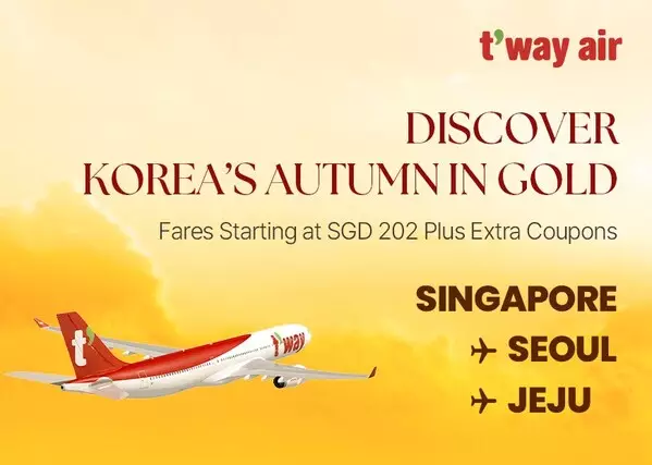 SINGAPORE, Sept. 17, 2025 /PRNewswire/ -- T'way Air, Korea's leading low-cost carrier, invites travelers to enjoy special savings through its "Golden Autumn Deal" until September 30, for bookings on Singapore–Incheon (Seoul) and Singapore–Jeju flights for travel through March 28, 2026.