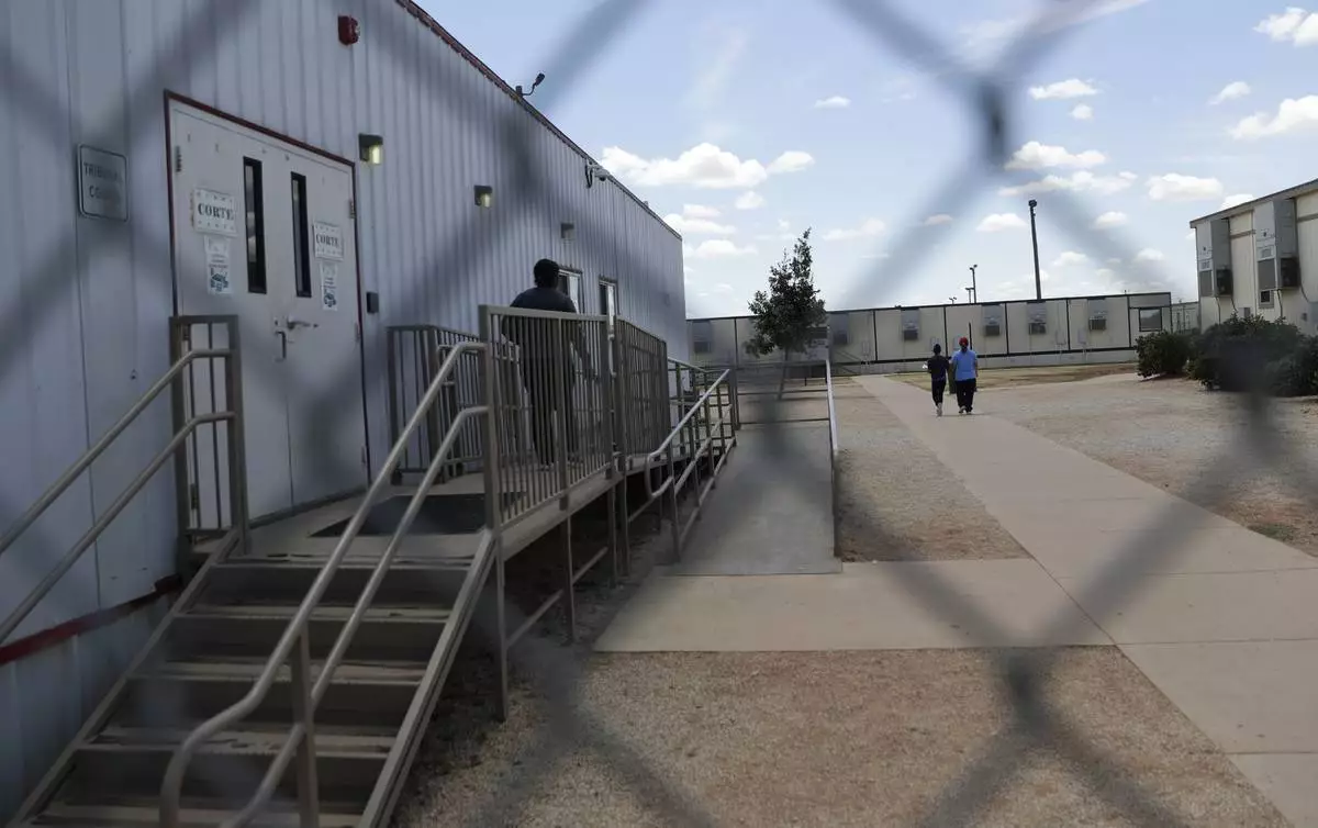 FILE - Immigrants seeking asylum walk at the ICE South Texas Family Residential Center, on Aug. 23, 2019, in Dilley, Texas. (AP Photo/Eric Gay, File)