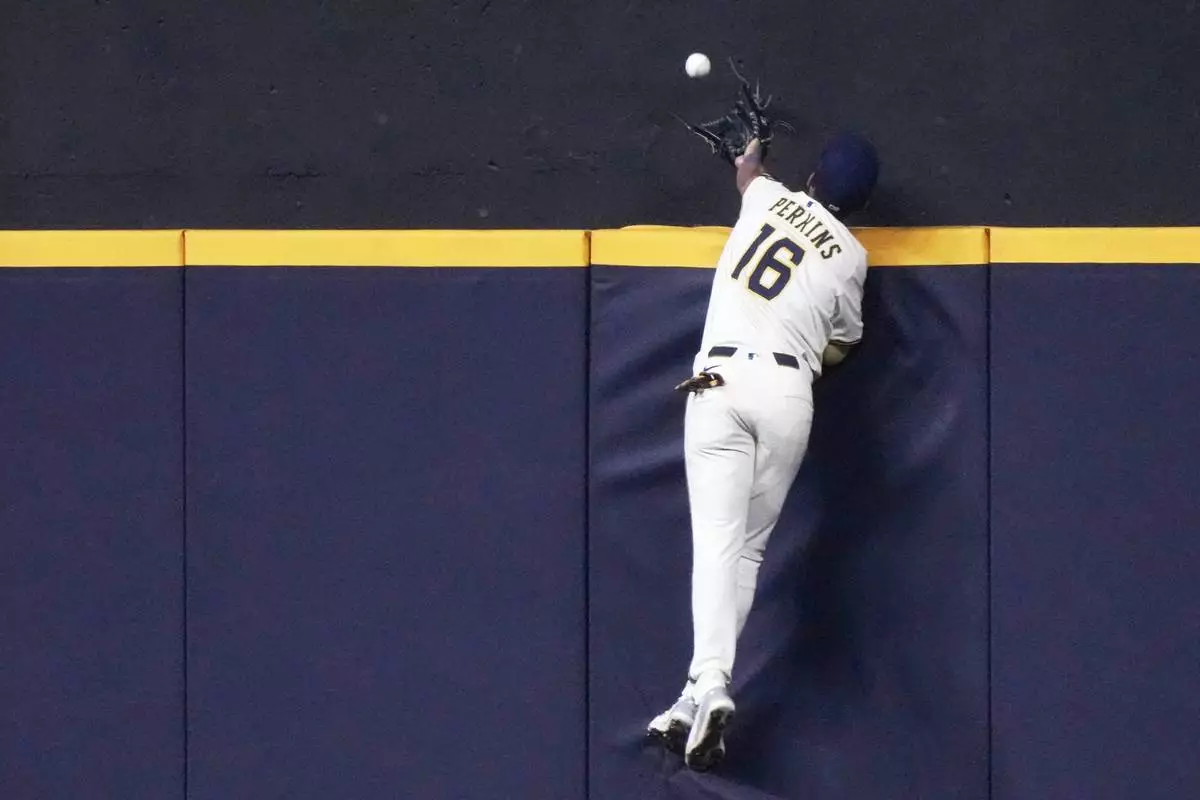 Milwaukee Brewers' Blake Perkins can't catch a home run hit by Los Angeles Angels' Denzer Guzman during the fifth inning of a baseball game Tuesday, Sept. 16, 2025, in Milwaukee. (AP Photo/Morry Gash)