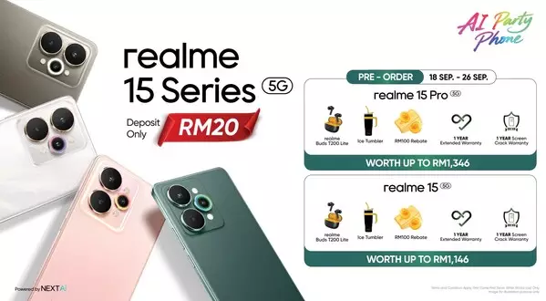 KUALA LUMPUR, Malaysia, Sept. 12, 2025 /PRNewswire/ -- Why settle for one way to capture life's moments when you can have three? Dubbed the segment's best imaging smartphone, the realme 15 Series boasts a revolutionary camera system built on a 3-in-1 concept that combines professional-grade photography, cinematic video recording, and dynamic live photos in one sleek smartphone. This AI Party Phone will be available for pre-order starting 18 September, and early-bird customers will be receiving free gifts worth up to RM1,346.