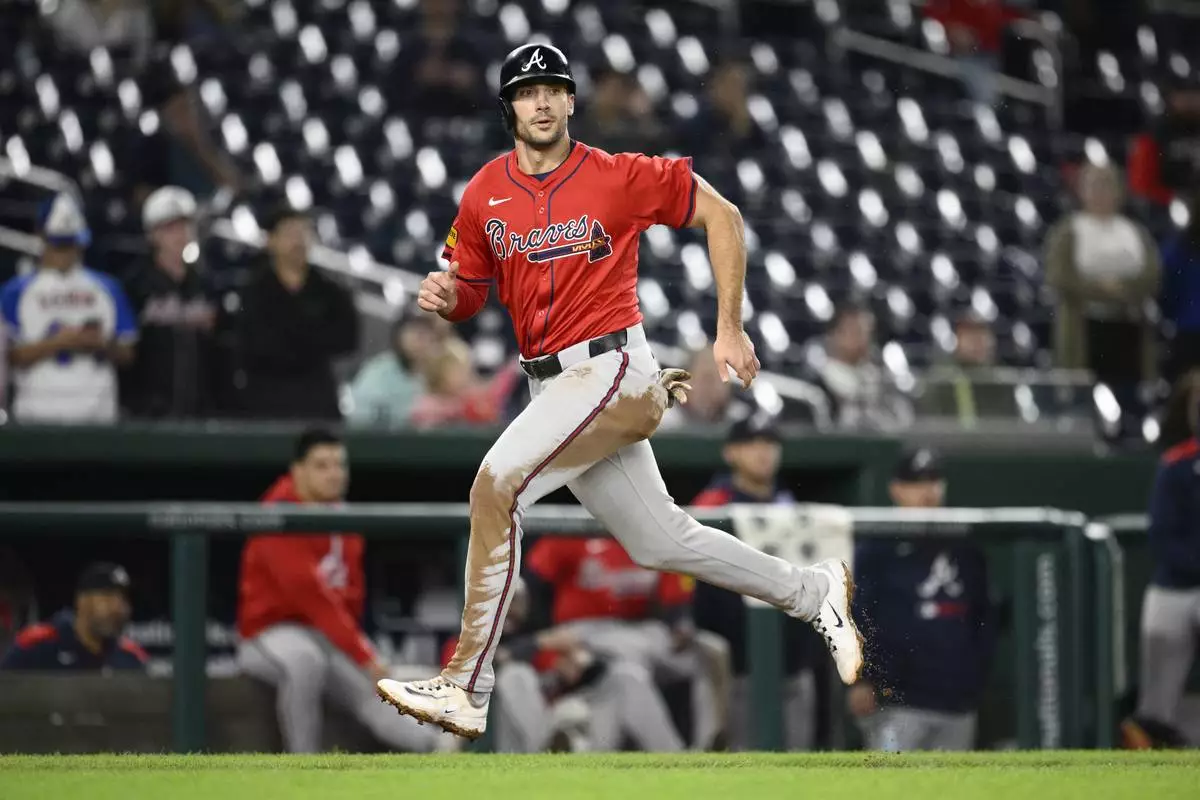 Atlanta Braves' Matt Olson runs towards home to score on a sacrifice fly by Ozzie Albies during the 10th inning of the second baseball game of a doubleheader against the Washington Nationals Tuesday, Sept. 16, 2025, in Washington. (AP Photo/Nick Wass)