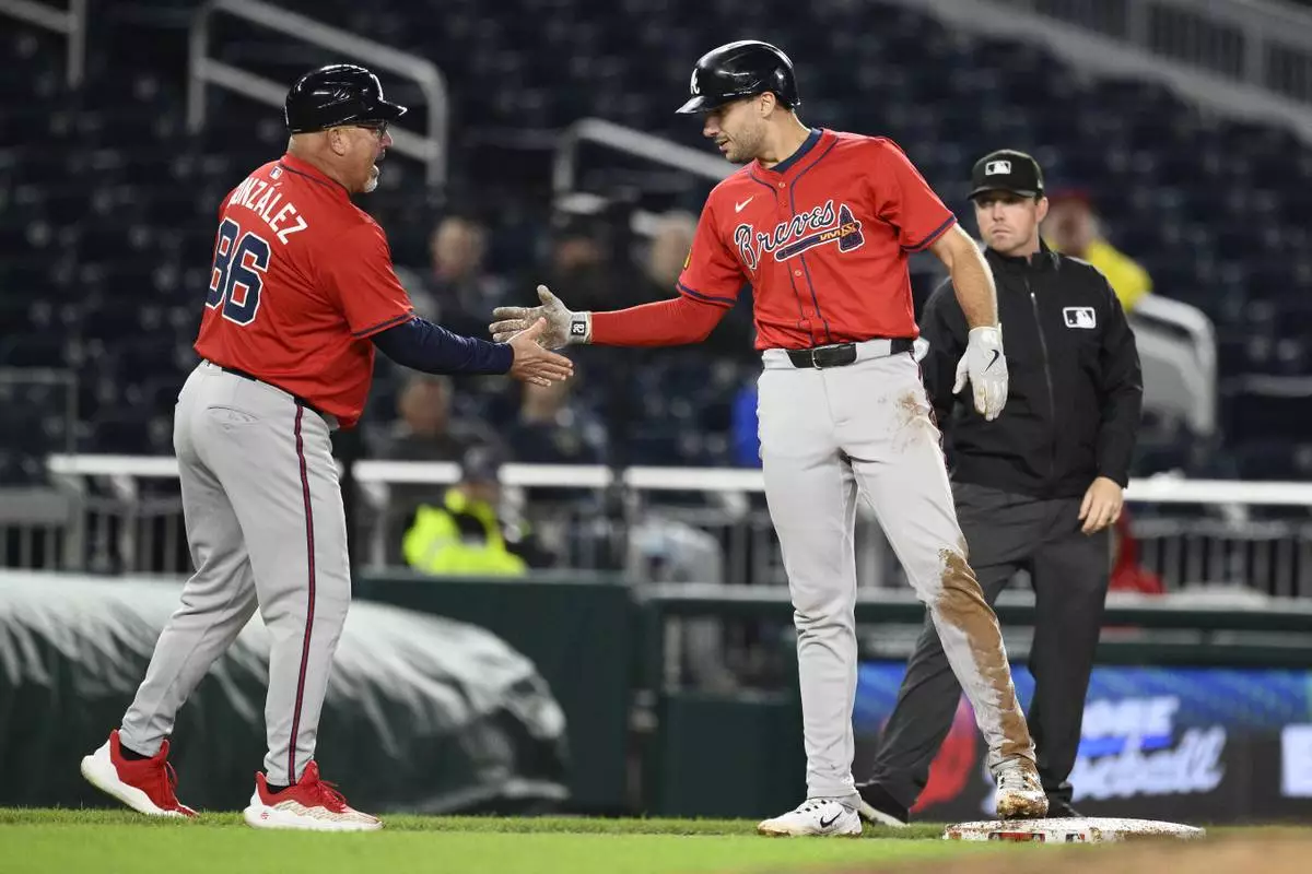 Atlanta Braves' Matt Olson, right, celebrates with third base coach Fredi González (86) after hitting a triple to drive in three runs during the 10th inning of the second baseball game of a doubleheader against the Washington Nationals, Tuesday, Sept. 16, 2025, in Washington. (AP Photo/Nick Wass)