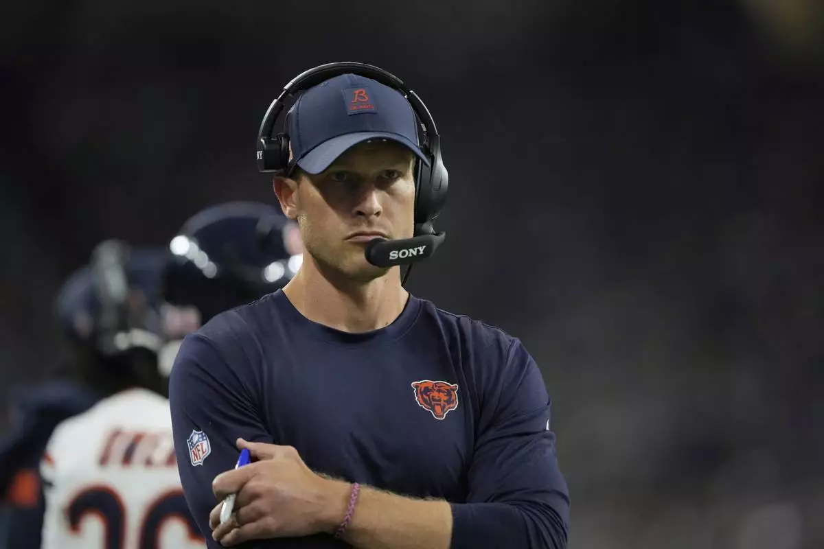 Chicago Bears head coach Ben Johnson watches from the sidelines during the first half of an NFL football game against the Detroit Lions in Detroit, Sunday, Sept. 14, 2025. (AP Photo/Ryan Sun)