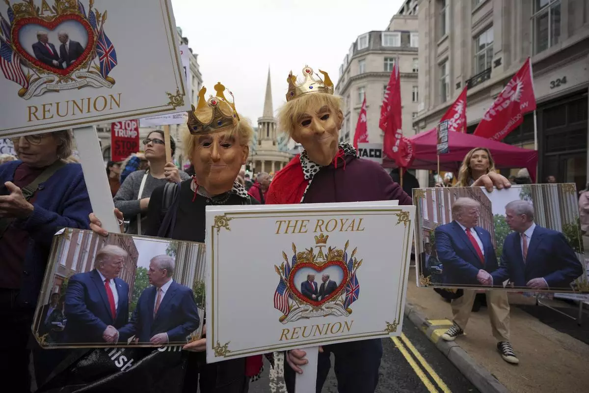 Protesters wear royal costumes during a demonstration of the Stop Trump Coalition group against President Donald Trump's state visit in London, Wednesday, Sept. 17, 2025.(AP Photo/Kin Cheung)